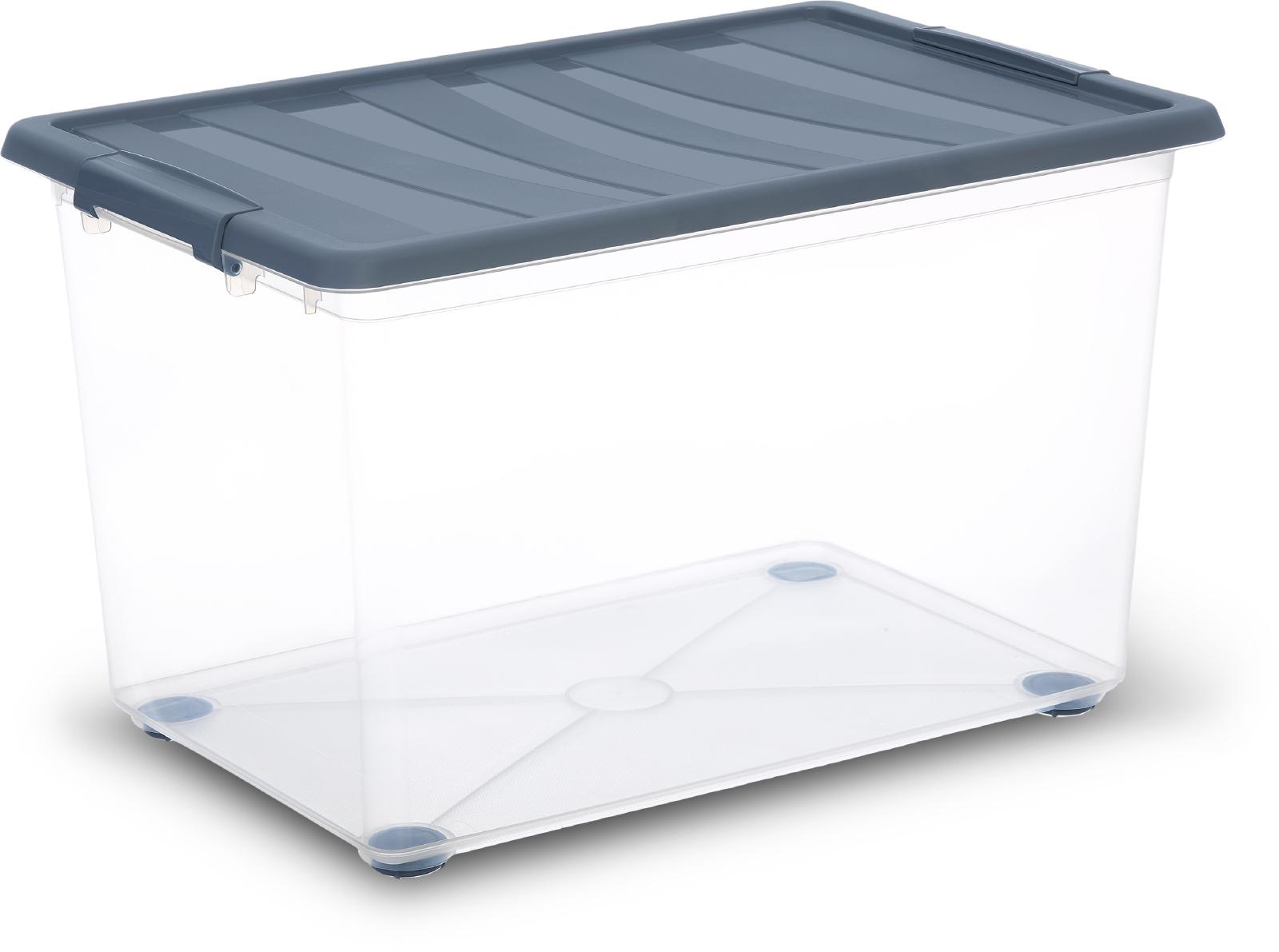 Iz plastike, z ročaji in vrtljivimi kolesi. Na voljo: - zaboj mere 59 x 39 x 36,5 cm, 57 l - komplet 2 zabojev mere 39 x 29 x 15,5 cm, 12 l.