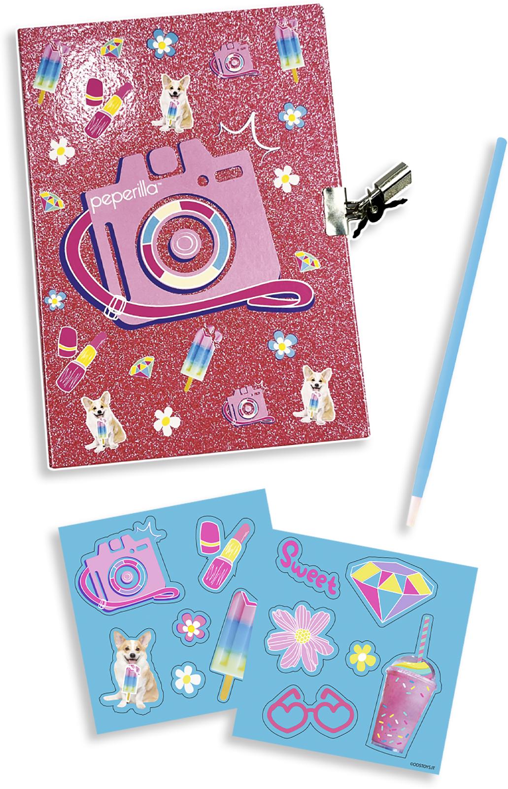 Na voljo: skrivni dnevnik s ključavnico, s 50 stranmi, 1 pisalom in 2 listi z nalepkami ali nakit z zamenljivimi zapestnicami in obeski.