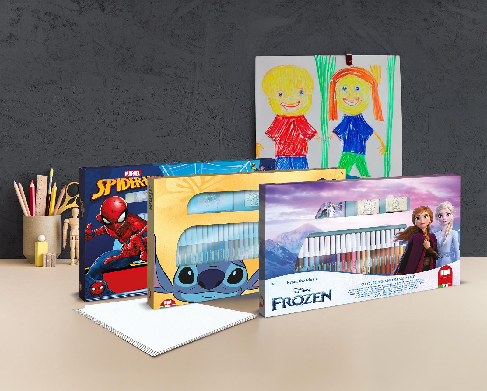 Vsebuje 28 flomastrov Giotto Turbocolor, 3 žige iz lesa in gume, 1 modro črnilo in album za žigosanje in barvanje. Motivi: Spiderman, Frozen ali Stitch.