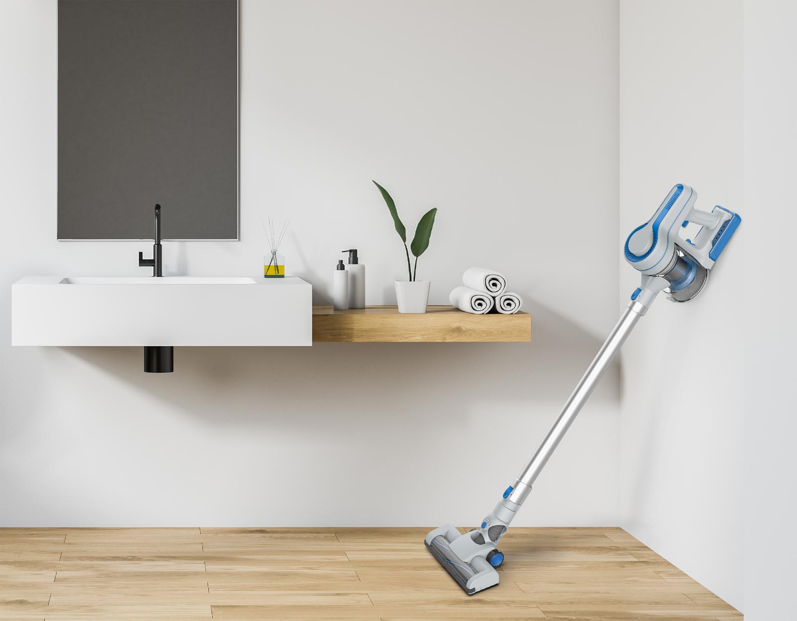 2 stopnji sesanja, Hepa filter, ciklonska tehnologija, motorizirana vrtljiva krtača, priloženi dodatki: krtača, nastavek za fuge, aluminijasta cev, vrtljiva električna krtača in stenski nosilec. Polnilna litijeva baterija: 2200 mAh/22,2 V.