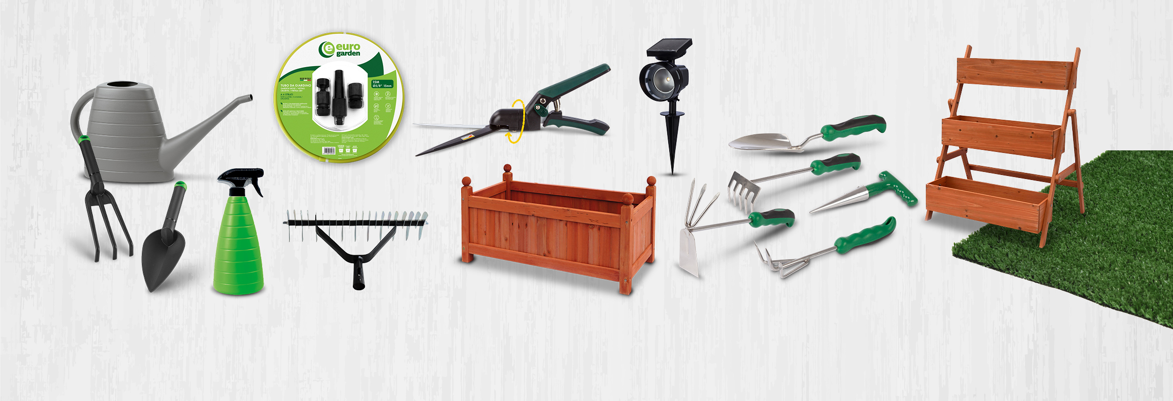 Na voljo: posoda z ročajem 1030 ml, razpršilnik 785 ml, zalivalnik 1850 ml, grabljice ali lopatka za presajanje.